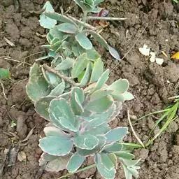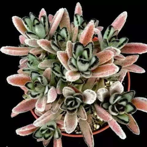 叶片对生,肉质,叶片如银富磷,叶缘边上有均匀的点,在充足的阳光下,叶子会变得肥厚饱满,全叶覆盖细细的绒毛,长得胖嘟嘟、毛茸茸,十分可爱。开花五瓣,花色白色。