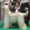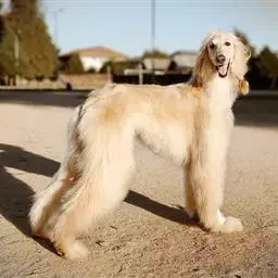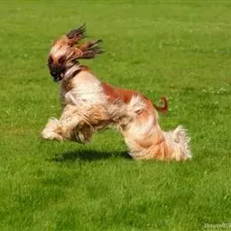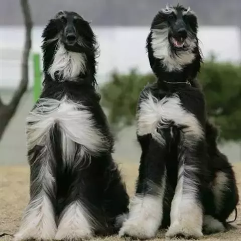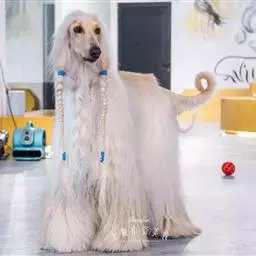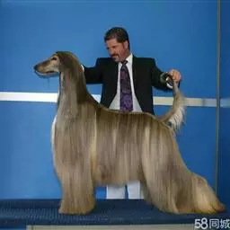 阿富汗猎犬全身披丝绢状的长毛,毛色鲜艳,呈多种颜色,背中线附近毛短,…