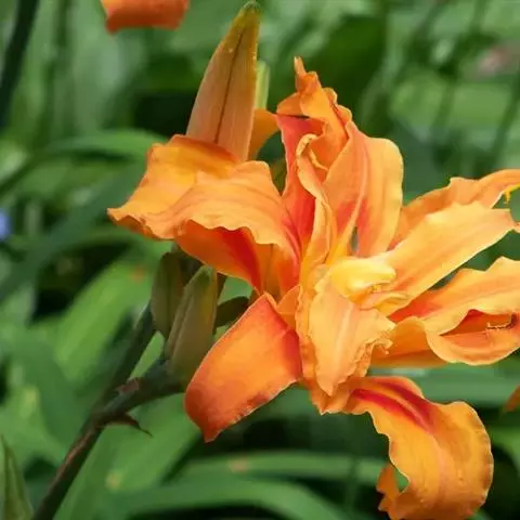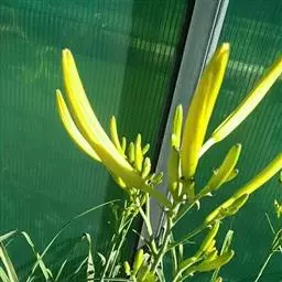 花茎自叶腋抽出,茎顶分枝开花,有花数朵,大,橙黄色,漏斗形,花被6裂。蒴果,革质,椭圆形。种子黑色光亮。
