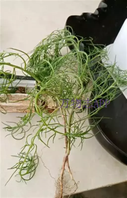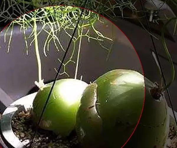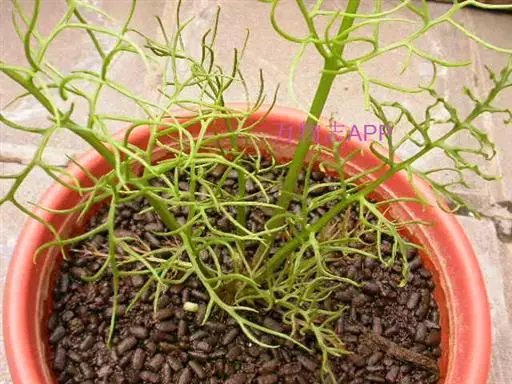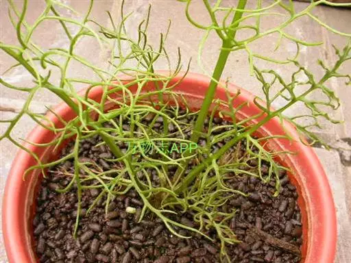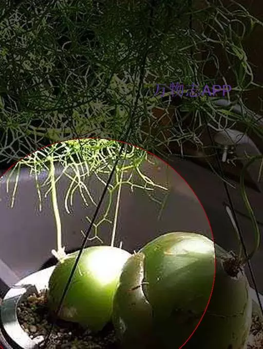 多年生草本多浆植物。植株具大型肉质球茎,洋葱状,凹陷球状,直径20-30厘米,表皮淡绿色,有光泽。根,肉质,白色,直径5毫米。春季由球茎顶部长出一对细长的对生叶,然后再簇生出绿色枝条,长2.5 -6(-10)米,缠绕攀援,枝条上有细小的绿色线形鳞片状叶,但早脱落,很小,线状披针形,具管状,寿命短,很快被真鳞片的开花茎所取代迅速。随着它的成熟,形成密集的花边分支并呈现出完整的外观。分支钻成7厘米长,直径2-7厘米。当秋天到来时,增长就会死去,进入休眠期。片狭披针形,长3-5毫米,具短刺。