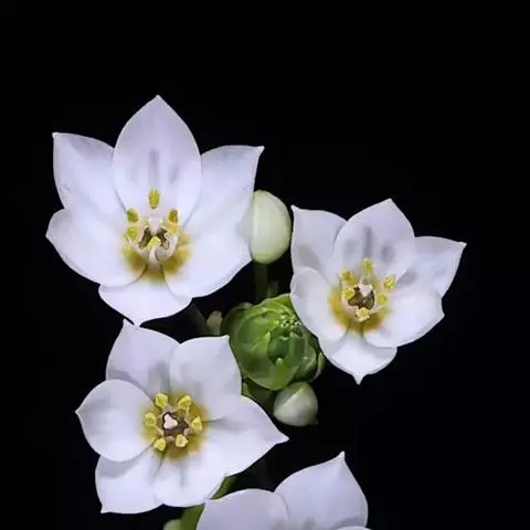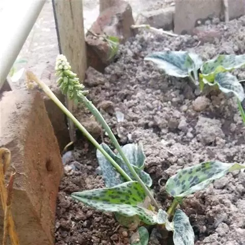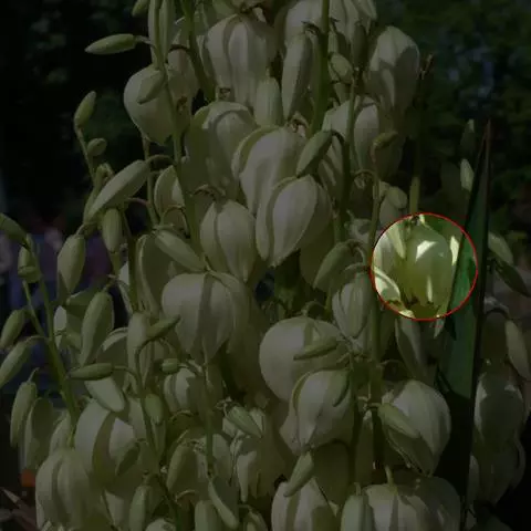花单生,星状,六裂,绿白色,宽10-16毫米,直径0.7-0.9厘米,散在长的缠绕总状花序上;花梗成拱形,长2-10厘米。花被片游离到基部,5-9(-12)×3.5毫米,白色或绿色到黄绿色,漆皮或反折,长圆形到披针形,边缘向基部回旋,先端亚急性;花柱6,圆柱状,柱头三裂。细丝直立;仅在中度至充分的阳光下才能产生花朵,在这种情况下,每枝植物会开花数十朵花;花有难闻的气味。花期:春天,一年会开花2次。果实椭圆形,先端尖,长1.2-1.6厘米。种子黑色,长方形,有光泽,长5-10毫米。