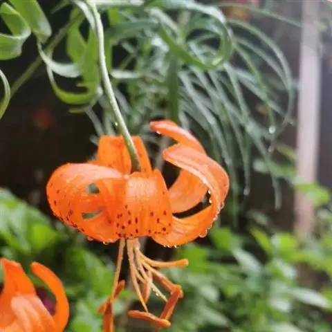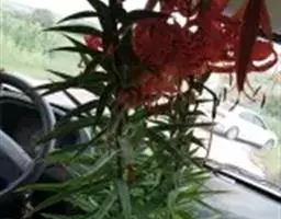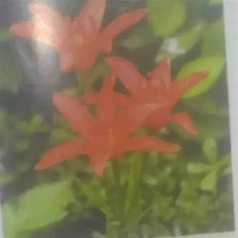 花1-5朵排成近伞形或总状花序;花梗长1.2-4.5厘米;花直立,星状开展,深红色,无斑点,有光泽;花被片矩圆状披针形,长2.2-4厘米,宽4-7毫米,蜜腺两边具乳头状突起;雄蕊向中心靠拢;花丝长1.8-2厘米,无毛,花药长矩圆形,长约7毫米;子房圆柱形,长1-1.2厘米,宽2.5-3毫米;花柱稍短于子房,柱头稍膨大。