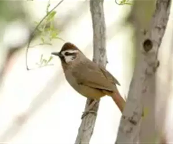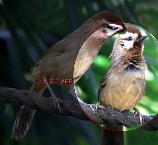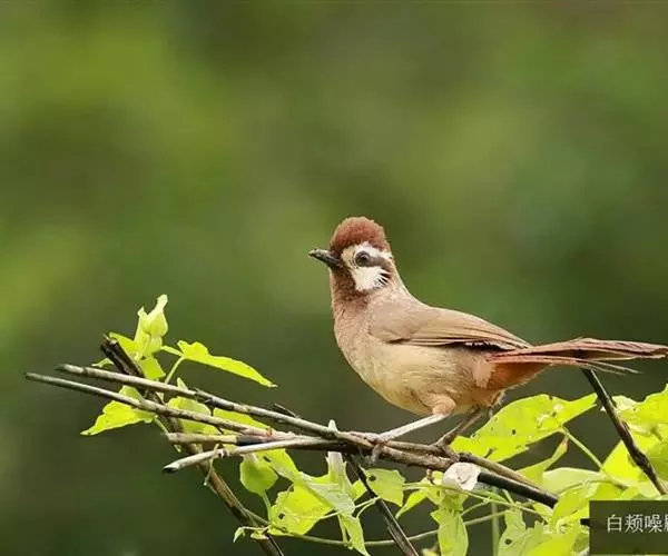 白颊噪鹛(学名:Pterorhinus sannio):中型鸟类,体长21-25厘米。雌雄羽色相似。前额至枕深栗褐色,眉纹白色或棕白色、细长,往后延伸至颈侧。背、肩、腰和尾上覆羽等其余上体包括两翅表面棕褐或橄榄褐色,尾栗褐或红褐色,飞羽暗褐色,外翈羽缘沾棕。颊、喉和上胸淡栗褐色或棕褐色,下胸和腹多呈淡棕黄色或淡棕色,两胁暗棕色。特征明显,野外容易识别。 相似种画眉眼周白色,颊不为白色,明显可与之区别。