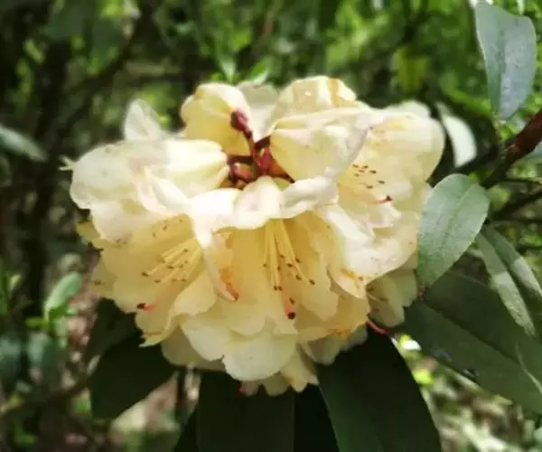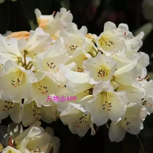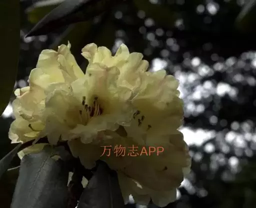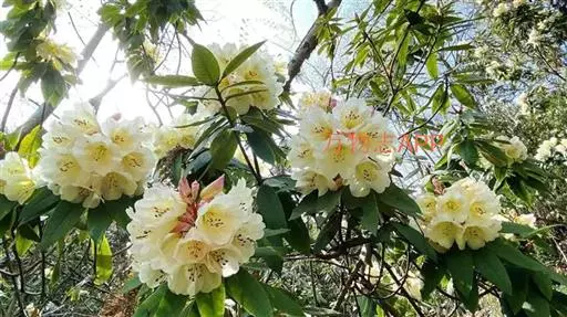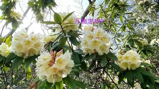 露珠杜鹃(学名:Rhododendron irroratum Franch.):灌木或小乔木,高约2-9米;小枝粗壮,直径约4-5毫米;幼枝有薄层绒毛和腺体,以后逐渐脱落;老枝光滑。叶多密生于枝顶,革质,椭圆形、披针形或长圆状椭圆形。总状伞形花序,有7-15花;花冠管状或钟状,长3-4厘米,淡黄色、白色或粉红色,有黄绿色至淡紫红色斑点,5裂,裂片半圆形。蒴果圆柱状。花期3-5月,果期9-10月。