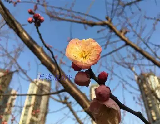 梅(学名:Armeniaca mume Sieb.):小乔木,稀灌木,高4-10米;树皮浅灰色或带绿色,平滑;小枝绿色,光滑无毛。叶片卵形或椭圆形,叶边常具小锐锯齿,灰绿色。花单生或有时2朵同生于1芽内,直径2-2.5厘米,香味浓,先于叶开放;花萼通常红褐色,但有些品种的花萼为绿色或绿紫色;花瓣倒卵形,白色至粉红色。果实近球形,直径2-3厘米,黄色或绿白色,被柔毛,味酸;果肉与核粘贴;核椭圆形,两侧微扁。花期冬春季,果期5-6月。2n=16,24。