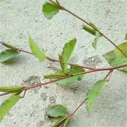 一年生直立木质草本,高1~4m,全株无毛。叶纸质,卵状披针形至狭窄披针形,长5~12cm,宽2~5cm,先端渐尖,基部圆形,3出脉的两侧脉上行不过半,中脉有侧脉6~7对,边缘有粗锯齿,近基部各有1齿伸长而成钻形;叶柄长约2cm,有柔毛;托叶线形,脱落。聚伞花序腋生,有数朵花,花小,黄色;萼片淡紫色,长约4mm;花瓣倒卵形,与萼片近等长;雄蕊多数;子房无毛。蒴果球形,直径约1cm,有纵棱和疣状突起,顶端截形或凹陷,成熟时5瓣裂。花期7—8月,果期9—10月。