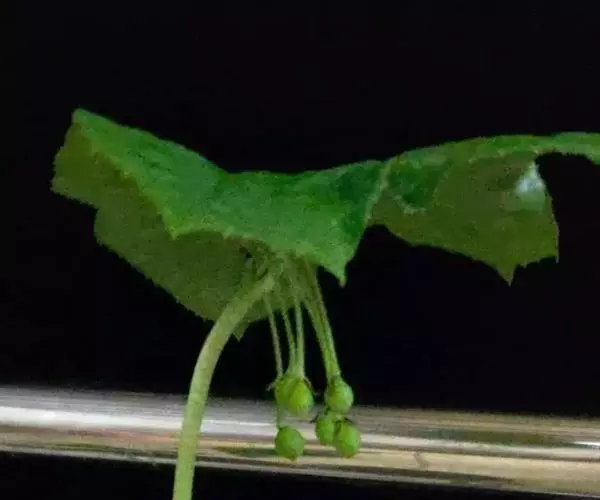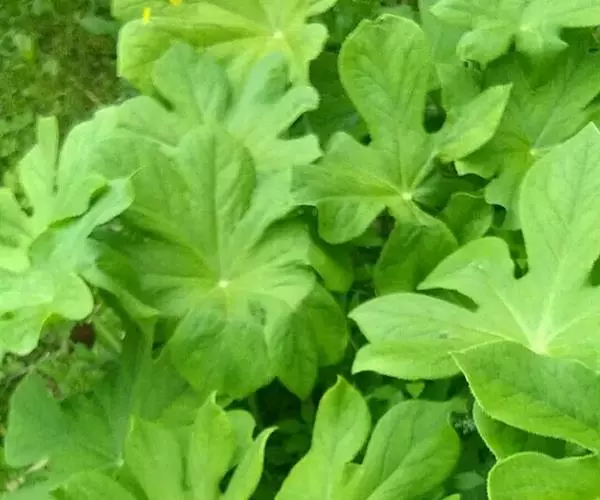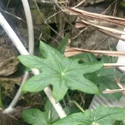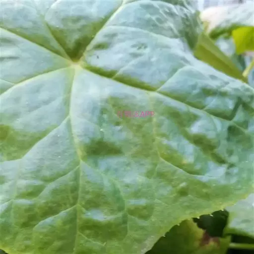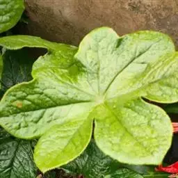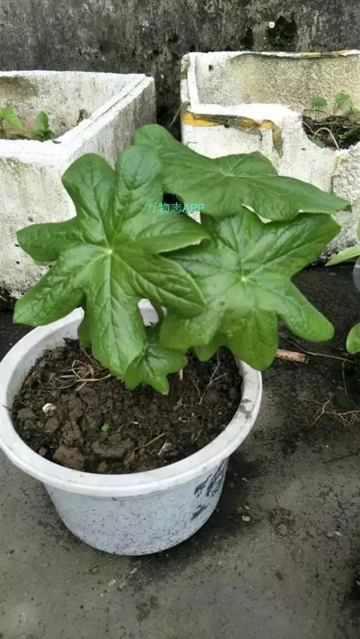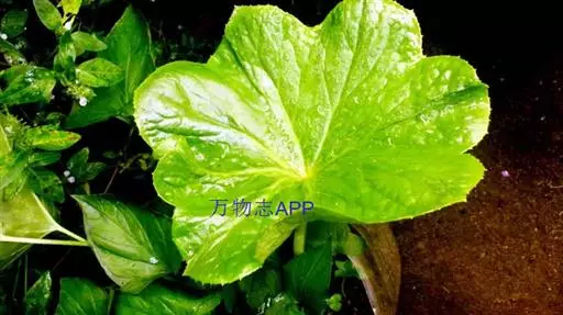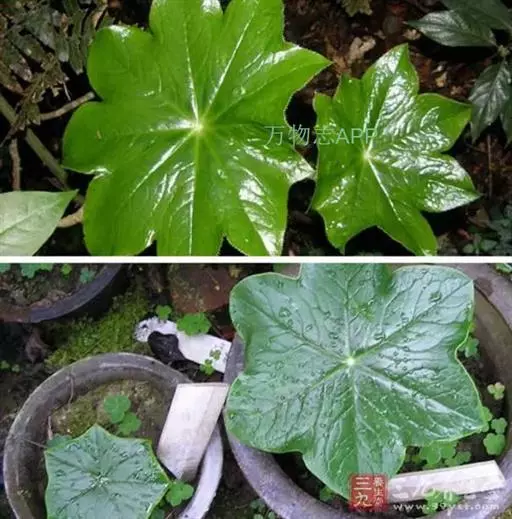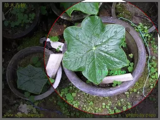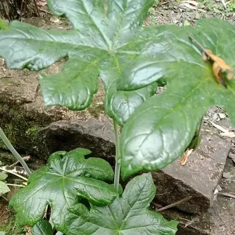 茎生叶2枚,薄纸质,互生,盾状,近圆形,直径达30厘米,4-9掌状浅裂,裂片阔三角形,卵形或卵状长圆形,长2.5-4厘米,基部宽5-7厘米,先端锐尖,不分裂,上面无毛,背面被柔毛,叶脉明显隆起,边缘具细齿;下部叶的柄长12-25厘米,上部叶柄长1-3厘米。