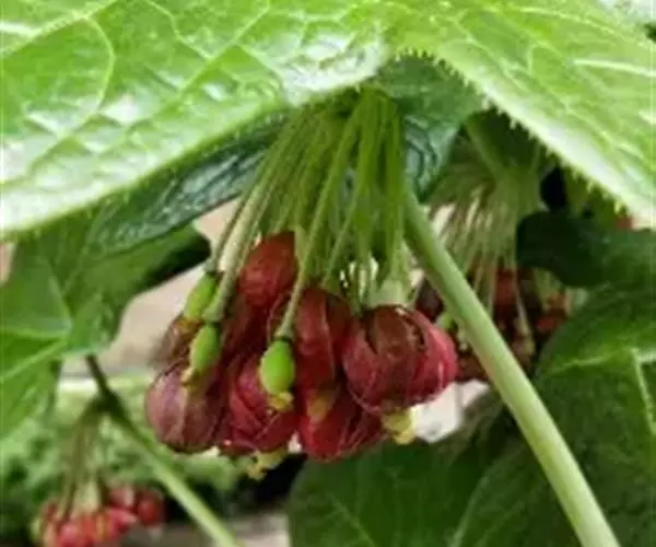 花梗纤细、下弯、被柔毛;花深红色,5-8朵簇生于离叶基部不远处,下垂,花着生于叶腋;萼片6,长圆状椭圆形,长0.6-1.8厘米,宽6-8毫米,先端急尖,外面被短柔毛,内面无毛;花瓣6,勺状倒卵形,长约2.5厘米,宽约8毫米,无毛;雄蕊6,长约1.8厘米,花丝短于花药,药隔先端急尖,无毛;子房椭圆形,无毛,花柱短,柱头盾状。