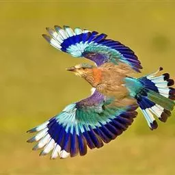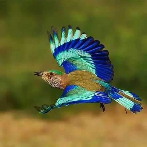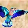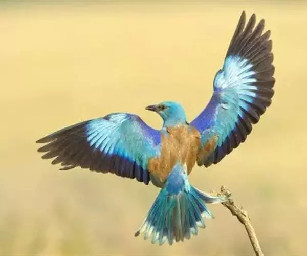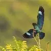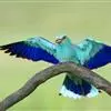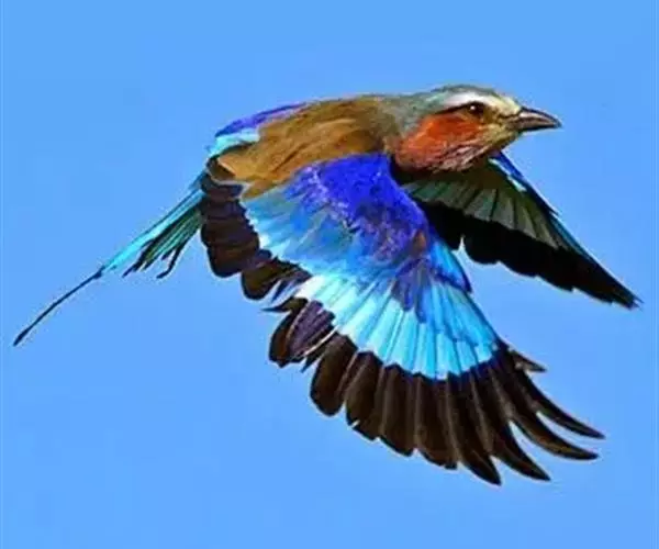 蓝胸佛法僧(学名:Coracias garrulus)中型鸟类,体长31~33厘米,通体淡蓝绿色。翅膀长而宽,除栗色背羽外大部分为蓝色。额、眼先、耳羽淡褐色;头顶、颊、腰淡蓝绿色。背、肩、最内侧数枚飞羽沙棕色。翼覆羽绿蓝色,小,中覆羽端部沾沙棕色,其余飞羽黑褐色。尾上覆羽、尾羽褐色。覆羽沾满绿蓝色。颏近白色,喉以下淡绿蓝色,喉至胸沾淡黄褐色。翅膀前缘鲜中蓝色,翅尖黑色。翅和尾上有一淡蓝色斑。