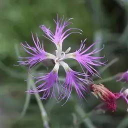 须苞石竹(学名:Dianthus barbatus L.)是石竹科,石竹属多年生草本植物,高可达60厘米,全株无毛。茎直立,叶片披针形,顶端急尖,基部渐狭,中脉明显。花多数,集成头状,有数枚叶状总苞片;花梗极短;苞片卵形,顶端尾状尖,边缘膜质,花萼筒状,裂齿锐尖;花瓣具长爪,瓣片卵形,;雄蕊稍露于外;子房长圆形,花柱线形。蒴果卵状长圆形,种子褐色,扁卵形,5-10月开花结果。