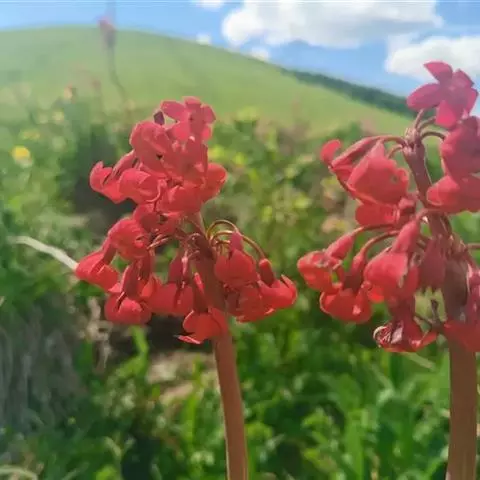 稀有花卉,又叫美国樱草,美国一茎十二花。叶基生,叶片较大,花葶细长高挺,花淡粉色,花瓣向上翻折,花像一颗颗坠落的流星般动感。