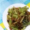 2、炒锅加油烧热,下红椒丝和香干翻炒,加入少许盐、蒜粉、生抽调味,如果太干可加入少许水;