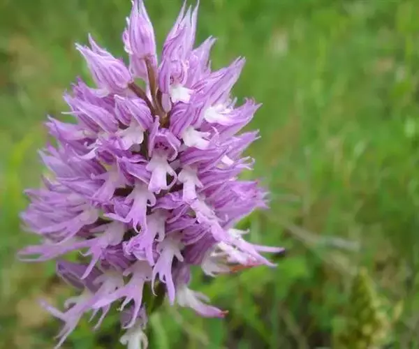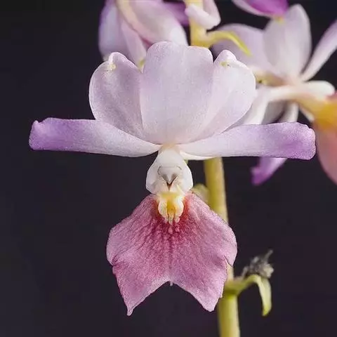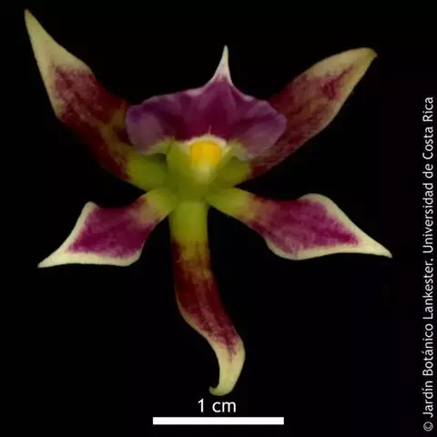 植株高约25厘米。假鳞茎很短,粗约7毫米,具2枚鞘和3-4枚叶。假茎长约3厘米。叶在花期全部展开,椭圆形或长圆形,长8-11厘米,中部宽2.5-3.5厘米,先端短渐尖,基部收狭为长约1厘米的柄,两面无毛;花葶出自叶丛中央,直立,长24厘米,被短柔毛;总状花序长约4厘米,疏生少数花;花序柄常被两枚筒状鞘;花苞片卵状披针形,长约1厘米,先端渐尖;花梗和子房长约2厘米;萼片和花瓣淡黄色,具紫红色的脉纹;中萼片卵状披针形,长1.7厘米,中部宽5毫米,先端渐尖,具5条脉;侧萼片斜卵状披针形,与中萼片近等大,先端渐尖,具3-5条脉;花瓣线形,长1.3厘米,中部宽2毫米,先端渐尖,具2-3条脉;唇瓣白色,基部与整个蕊柱翅合生,基部上方3裂;侧裂片斜椭圆形,比中裂片小,先端稍钝,边缘稍具齿;中裂片近肾形或横长圆形,先端近截形并微凹,边缘波状;唇盘上具7条鸡冠状褶片,其中3条褶片较长并延伸到中裂片先端;距短而劲直,长2-3毫米,末端钝,外面被短柔毛;药帽近半球形,前端收狭而呈喙状;花粉团倒卵球形,具很短的花粉团柄;蕊喙2裂,裂片牙齿状三角形。花期7月。
