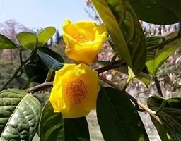 滇山茶:灌木至小乔木,有时高达15米,嫩枝无毛。叶阔椭圆形,上面干后深绿色,发亮,下面深褐色,无毛,…