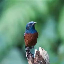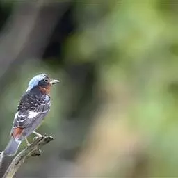 蓝头矶鸫(学名:Monticola cinclorhynchus)为鹟科矶鸫属的鸟类,是一种候鸟,俗名臭皮翠、白喉叽鸫、白喉石鸫、葫芦翠、虎皮翠。全长19厘米。自额至后颈及翅上的小覆羽均钴蓝色。腰和尾上覆羽浓栗。内侧飞羽有一白色块斑。喉部中央有一大型白斑。下体浓栗色,至尾下覆羽转为棕黄。以各种昆虫为食。每年的4-5月份及10至11月份迁徙经过南北湖地区,白天逗留在树林里觅食。分布于西伯利亚、巴基斯坦、印度、东南亚各国、中国等地,主要生活于多岩山地的林间。该物种的模式产地在喜马拉雅山脉。