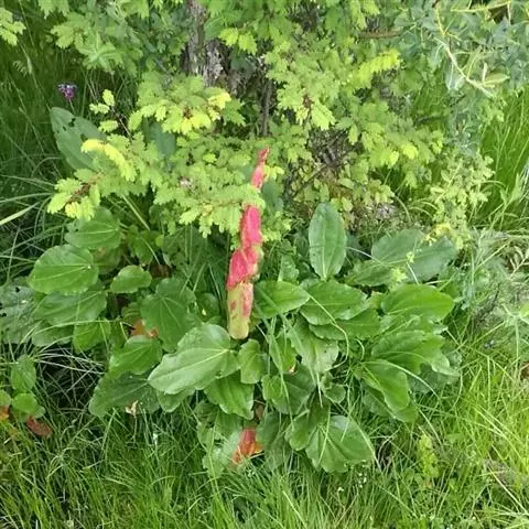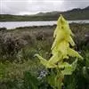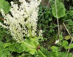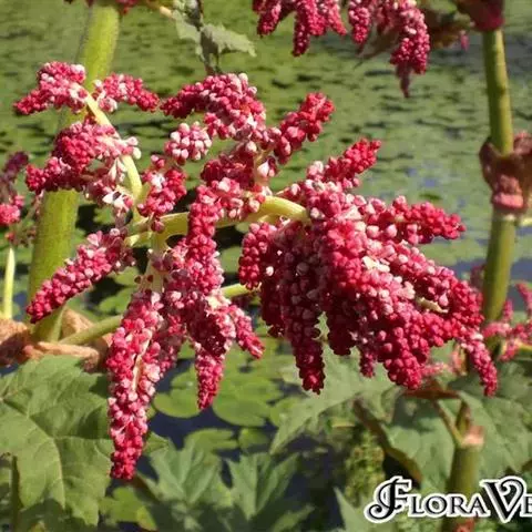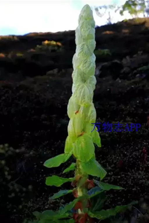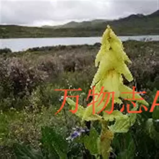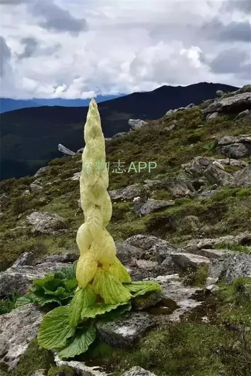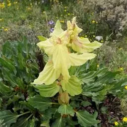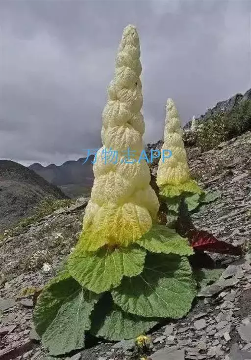 塔黄(学名:Rheum nobile Hook. f. et Thoms.):多年生草本,高1-2米。茎直立,粗壮,不分枝,具多数基生叶及大型苞片。基生叶卵圆形或近圆形,先端圆钝,基部浅心形,革质,上面无毛,下面具小突起;叶柄粗壮,长8-15厘米;托叶鞘膜质,红褐色;苞片卵圆形或圆形,膜质,淡黄色,具网状脉,反折,遮盖花序,花时脱落。花序圆锥状,分枝密集,无毛;花两性,花被片6,成2轮,宿存,椭圆形,淡绿色,花丝细长,外露;花梗中下部具关节;雄蕊9;花盘不发达,子房卵形,具3棱,花柱3,较短,柱头膨大成头状。瘦果连翅成宽卵形。