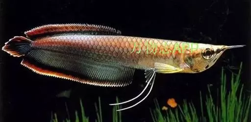 黑骨舌鱼(学名:Osteoglossum ferreirai):又名“黑龙鱼”。一般体长80厘米,体重400-600克,最大的个体长可达1米。体延长,侧扁。口上侧位。吻须一对。形状和银龙鱼几乎一样,成鱼为银色,但体形长大时会趋向黑色带紫和青色,有金带。极具观赏价值。幼鱼有明显的黑色体纹,胸鳍下挂着卵黄囊,所以香港人称之为黑龙吐珠。