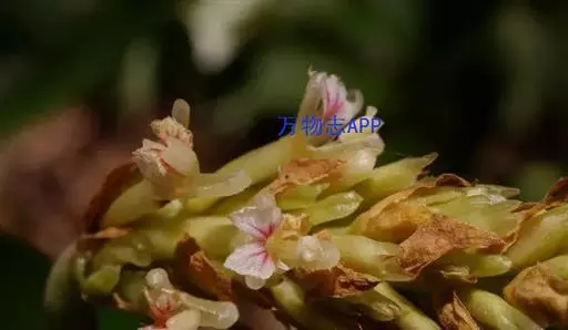 穗状花序顶生,长10-16厘米,总花梗近于无,基部具一线形的总苞片,长8-9厘米,宽8-10毫米;苞片披针形,或卵形,长1.5-2.5厘米,密集;每一苞片内有3枚小苞片和3朵花;小苞片披针形,长5-10毫米,苞片和小苞片均密被绒毛,果时宿存;花芳香;花萼筒状,长1-1.5厘米,顶端具明显三齿,外被绒毛;花冠管长1.2厘米,裂片长圆形,长6毫米,内凹;唇瓣菱状卵形或不明显三裂,长7毫米,中部宽5毫米,顶端2裂,边缘波状,中央有条纹;花丝长5毫米,花药长4毫米;柱头杯状,具缘毛,超出于药室之上。
