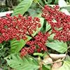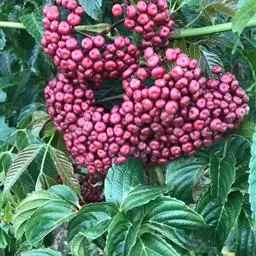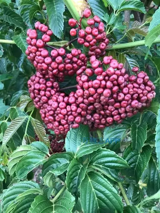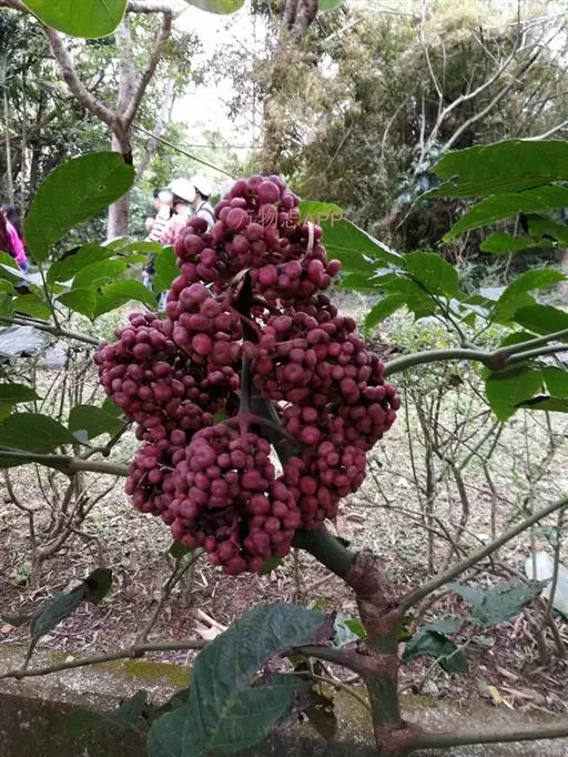 大型伞房状复二歧聚伞花序,直径达50厘米;花梗极短或几无梗,微被乳突状毛;花蕾高约3毫米;萼杯形,萼片三角形,顶端急尖,外面无毛,花瓣5,花瓣裂片椭圆形,长约5毫米;雄蕊5,花丝长1.2-1.6毫米,花药黄色;子房卵圆形,柱头不明显扩大。果实暗红色,扁球形,直径约8厘米。