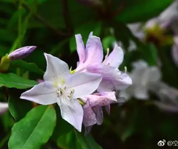 花芽长圆状锥形,顶端锐尖,鳞片倒卵形,外面无毛,边缘具微柔毛或细腺点。花单生枝顶叶腋,枝端具花1-4朵;花梗长1.5-2.7厘米,无毛;花萼不明显;花冠白色或带粉红色,长3.5-4厘米,直径约5厘米,5深裂,裂片开展,长圆形,顶端微凹,被微柔毛,花冠管长1.2-1.5厘米,向基部渐狭;雄蕊10,不等长,长2.7-3.5厘米,部分伸出花冠外,花丝扁平,中部以下被微柔毛;子房圆柱状,长7-9毫米,褐色,具纵沟,无毛,花柱长约3.5厘米,无毛,柱头5裂。