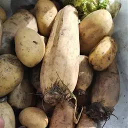 果实为茎块状,扁圆形或高15~80cm,球形,无毛或被疏柔毛。茎分地上茎和地下茎两部分。长圆形,直径约3~10cm,外皮白色、淡红色或紫色。薯皮的颜色为白、黄、粉红、红、紫色和黑色,薯肉为白、淡黄、黄色、黑色、青色、紫色及黑紫色。