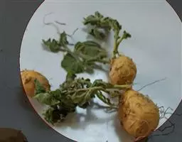 晚疫病可发生在叶、叶柄、茎和块茎上。叶部病斑多从叶尖或叶缘开始发生,产生圆形或半圆形暗绿或暗褐色大斑,边缘不明显。在空气湿度大时,病斑迅速扩大,可扩及叶的大半以至全叶,并可沿叶脉侵入叶柄及茎部,形成褐色条斑,使叶片萎蔫下垂,最后整个植株变为焦黑,呈湿腐状。在病斑边缘有一圈白霉,薯块感病形成淡褐色或灰紫色不规则形病斑,稍微下陷,病斑下面的薯肉变褐色,病薯易被其他腐生菌侵染而软腐。