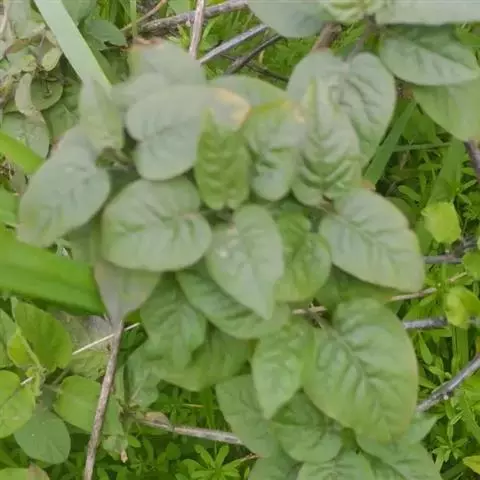 ⑶束顶型。病株叶柄与茎呈锐角着生,向上束起,叶片变小,常卷曲呈半闭合状,全株失去光泽的绿色,有的植株顶部叶片呈紫红色。薯块变长,芽眼突起,芽眉突出,有时表皮有纵裂纹。