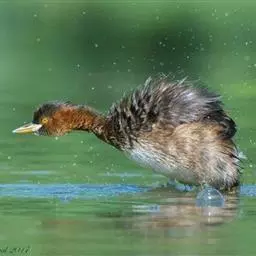 小鸊鷉(学名:Tachybaptus ruficollis):是一种潜鸟。体长25-29厘米,翼展 40-45厘米,体重100-200克,寿命13年。枕部具黑褐色羽冠;成鸟上颈部具黑褐色杂棕色的皱领;上体黑褐,下体白色。