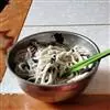 ②在汤面中加入蔬菜叶、适量食醋、芝麻油、香菜,味道鲜美,也可依个人口味任意配料。