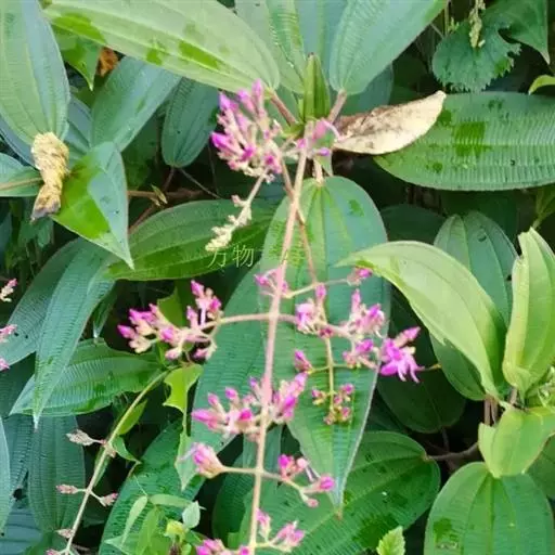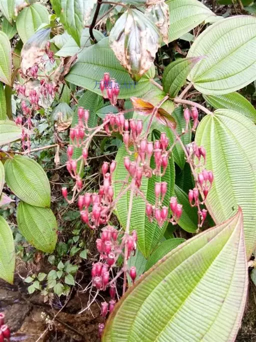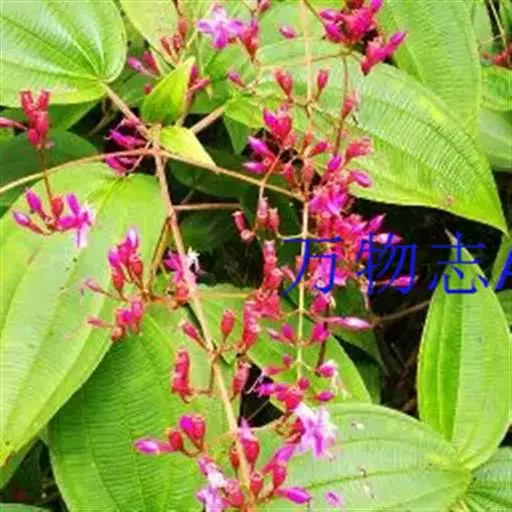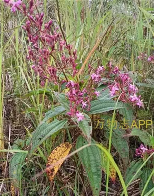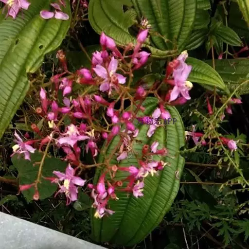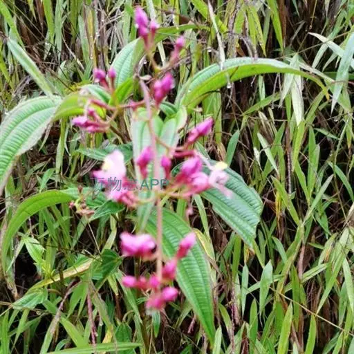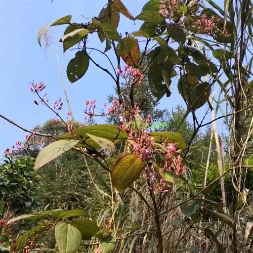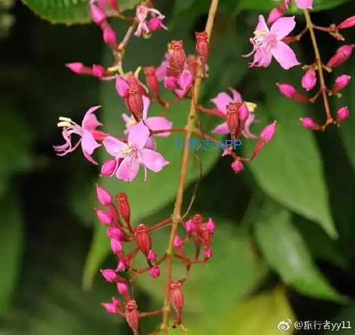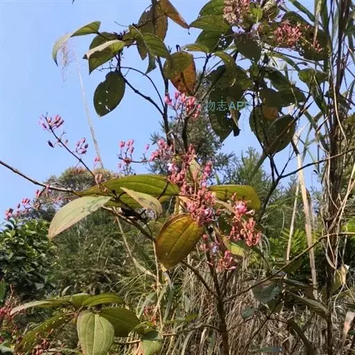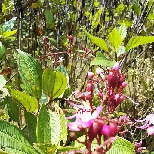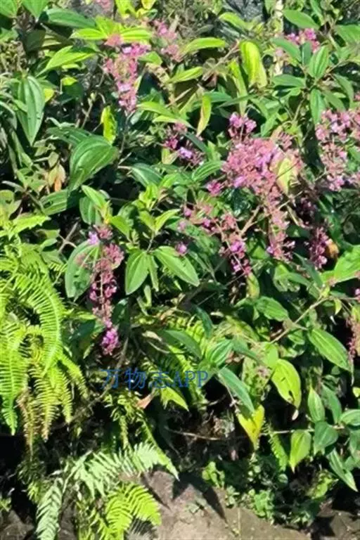 灌木,高1-2米,稀达6米;茎四棱形或钝四棱形,通常具槽,幼时被糠秕状星状毛及具微柔毛的疏刚毛。叶片坚纸质,卵形或狭椭圆状卵形或近椭圆形,顶端渐尖,基部圆形或浅心形,长12-24厘米,宽4.6-11厘米,稀长32厘米,宽15.5厘米,边缘具不整齐小齿,7基出脉,叶面被糠秕状鳞片或几无,基出脉下凹,背面通常仅于脉上被糠秕状星状毛,脉明显,隆起,细脉与侧脉垂直;叶柄长1-7.5厘米,有槽,通常密被糠秕状星状毛,槽内被具微柔毛的刚毛。由聚伞花序组成的圆锥花序,顶生,被糠批状星状毛,长20-30厘米,稀较短,基部具叶状总苞2;苞片和小苞片小,披针形或钻形,长1-3毫米;花萼长约8毫米,幼时密被星状毛,以后渐脱落,狭漏斗形,具钝四棱,有纵脉8条,裂片扁三角状卵形,长约1毫米,顶端急尖,具突起的小尖头;花瓣红色至粉红色,或深玫瑰红色,卵形,长约7毫米,于右上角突出1小片,顶端具突起的小尖头并被微柔毛;雄蕊长者紫色,药隔隆起而不伸长,短者黄色,药隔隆起,基部伸长成短距;子房下位,无毛。蒴果倒卵形,顶端具胎座轴,长约8毫米,直径约6毫米;宿存萼较果长,漏斗形。花期7-9月,稀10月,果期1-3月,稀达5月。