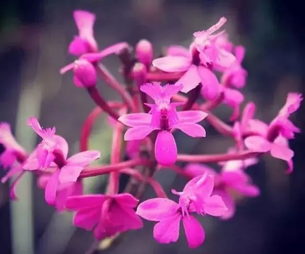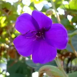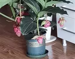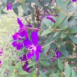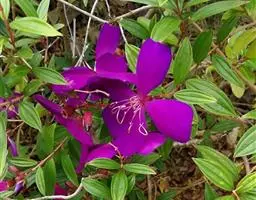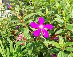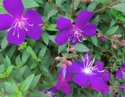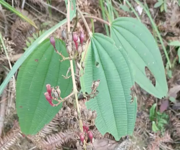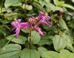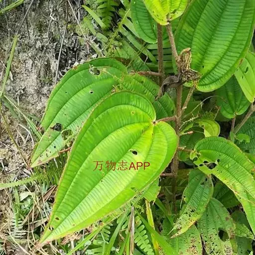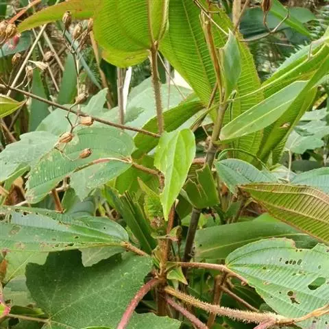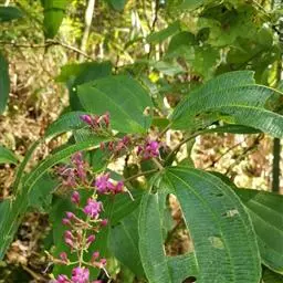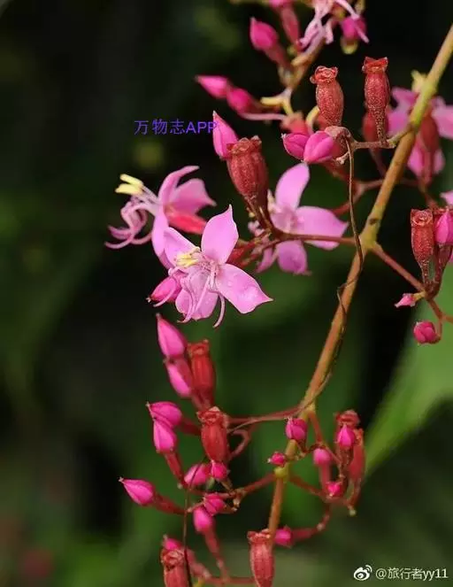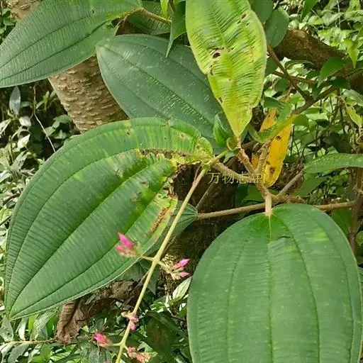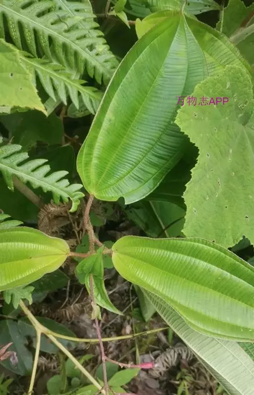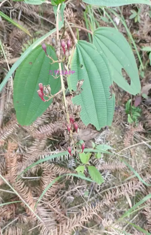 灌木,高1-2米,稀达6米;茎四棱形或钝四棱形,通常具槽,幼时被糠秕状星状毛及具微柔毛的疏刚毛。叶片坚纸质,卵形或狭椭圆状卵形或近椭圆形,顶端渐尖,基部圆形或浅心形,长12-24厘米,宽4.6-11厘米,稀长32厘米,宽15.5厘米,边缘具不整齐小齿,7基出脉,叶面被糠秕状鳞片或几无,基出脉下凹,背面通常仅于脉上被糠秕状星状毛,脉明显,隆起,细脉与侧脉垂直;叶柄长1-7.5厘米,有槽,通常密被糠秕状星状毛,槽内被具微柔毛的刚毛。由聚伞花序组成的圆锥花序,顶生,被糠批状星状毛,长20-30厘米,稀较短,基部具叶状总苞2;苞片和小苞片小,披针形或钻形,长1-3毫米;花萼长约8毫米,幼时密被星状毛,以后渐脱落,狭漏斗形,具钝四棱,有纵脉8条,裂片扁三角状卵形,长约1毫米,顶端急尖,具突起的小尖头;花瓣红色至粉红色,或深玫瑰红色,卵形,长约7毫米,于右上角突出1小片,顶端具突起的小尖头并被微柔毛;雄蕊长者紫色,药隔隆起而不伸长,短者黄色,药隔隆起,基部伸长成短距;子房下位,无毛。蒴果倒卵形,顶端具胎座轴,长约8毫米,直径约6毫米;宿存萼较果长,漏斗形。花期7-9月,稀10月,果期1-3月,稀达5月。