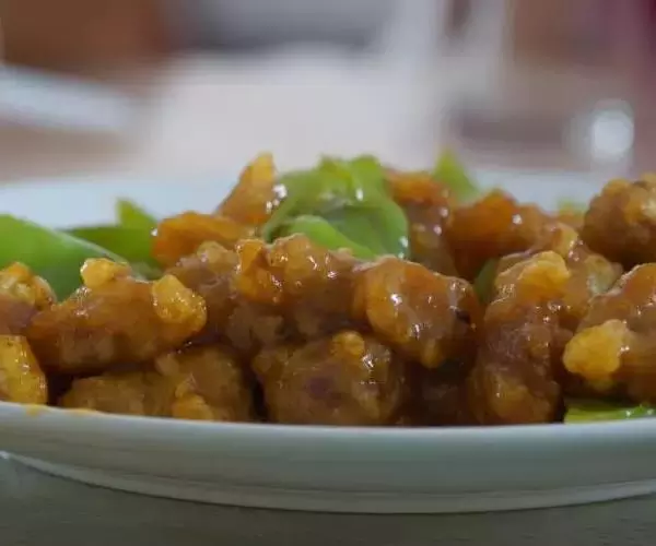炸时要待油沸后才可放下肉块,沸油可把肉外层的生粉收紧不脱落。炸之外层硬身时捞起,约2分钟后再放入沸油中炸至金黄色,然后爆炒料头,勾芡,将肉块兜匀,使每块肉都能沾满芡汁,上碟后不应有芡汁泻在碟上。