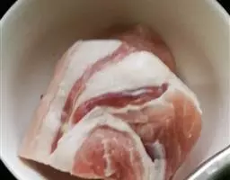 2:把五花肉扑上生粉,放5成热的油锅里炸熟,捞起,再烧热油锅炸至金黄色,再捞起备用