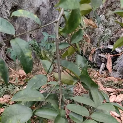 树皮灰色或灰黑色;木质部有粘液。幼枝被淡褐色短柔毛,渐变无毛。奇数羽状复叶,长16-22.5厘米;叶柄长2-3.5(6.5)厘米,叶轴长2.5-9厘米,叶轴在最上部一对小叶处延长0.2-2.6厘米生顶小叶;小叶3(-4)对,薄革质,披针形,长12-15厘米,宽约4 (-5)厘米,先端钝或渐尖,两面均无毛,侧脉5-7对;小叶柄长3-6毫米,有凹槽及短柔毛或近无毛。