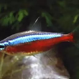 宝莲灯,学名阿氏霓虹脂鲤,也叫红莲灯、新日光灯鱼、新红莲灯鱼。是鲤形目、脂鲤亚目、脂鲤科,霓虹脂鲤属的一种重要观赏鱼,原产于南美洲亚马逊河流域。体纺锤形。体长约在4~5厘米,体表两侧各有一条绿带和一条红带,由眼部平行地延伸到尾柄处。红色带宽,几乎占满了整个腹部。较红绿灯颜色更艳丽,因而更名贵。