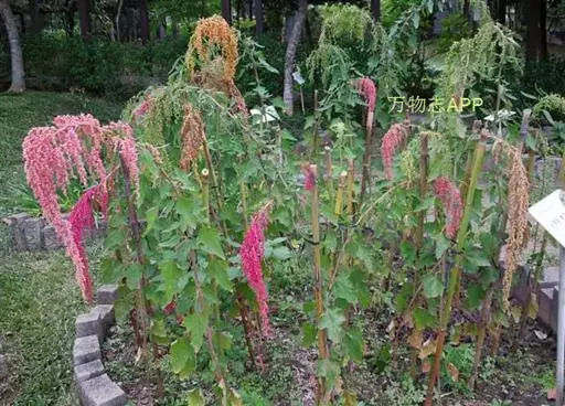 一年生草本,株高约 1~2 公尺,茎紫红色或有红色纵纹。叶互生,三角状狭卵形,长 1~5 公分,先端钝叶缘呈不规则状,波形至锯齿缘,基部楔形,叶下表面带粉;叶柄长 0.5~3 公分。穗状花序,顶生,花被片 5,春至夏开花结果。种子横生,果实穗状下垂,长可达1公尺,有红、橙红、紫红等颜色。花果期5-10月。原产地台湾、分布遍及全球温带及热带,我国各地均产。