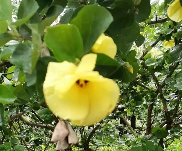海滨木槿(学名:Hibiscus hamabo Sieb. et Zucc.)是锦葵科木槿属植物,落叶小乔木,株高3-5米,胸径20厘米,扁球形树冠,枝叶繁盛。厚纸质单叶互生,扁圆形、倒卵形或宽倒卵形,先端钝近平,具短突尖,基部圆形或浅心形,叶缘中上部具细圆齿,叶面绿色光滑、具星状毛。花两性,单生于近枝端叶腋,花梗长0.5-1厘米,小苞片数8-10,花萼长2厘米,花冠直径5.8厘米。三角状卵形蒴果,长2厘米;褐色种子呈肾形,长0.5厘米,具腺状乳突。
