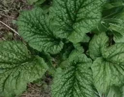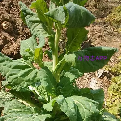 基生叶倒卵形或宽倒卵形,长20-30厘米,坚实,深绿色,有光泽,基部渐狭成宽柄。全缘或有不显明圆齿或波状齿。中脉白色。宽达1.5厘米,有多条纵脉;叶柄长3-5厘米,有或无窄边;下部茎生叶和基生叶相似,基部渐狭成叶柄;上部茎生叶倒卵形或椭圆形,长3-7厘米,宽1-3.5厘米,基部抱茎,宽展,两侧有垂耳,全缘,微带粉霜。