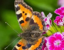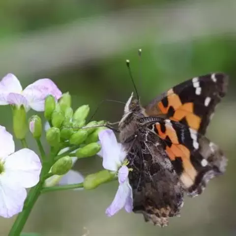 大红蛱蝶Vanessa indica Herbst,翅黑褐色,外缘波状。前翅M1脉外伸成角状,…