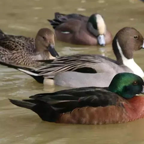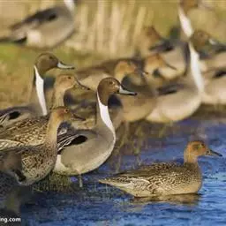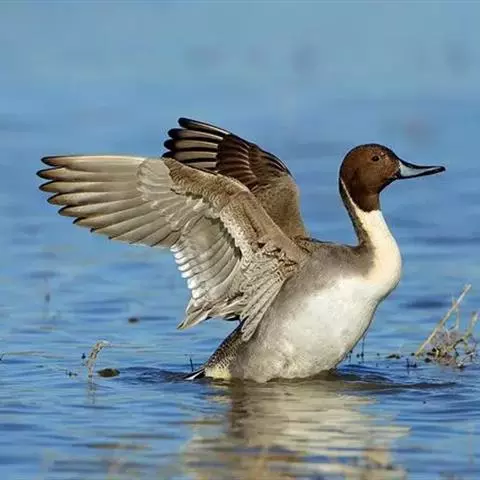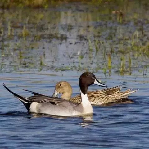 针尾鸭 越冬期栖息于各种类型的河流、湖泊、沼泽、盐碱湿地、水塘以及开阔的沿海地带和海湾等生境中,繁殖期主要栖息于内陆大型湖泊、流速缓慢的河流、河湾及其附近的沼泽和湿草地。