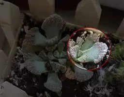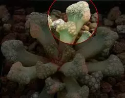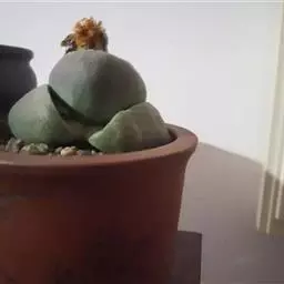 荒玉为番杏科生石花属,原产南非。株体呈白粉色,表面布满凹凸纹路,凹陷处为红褐色,每年秋季开黄花。