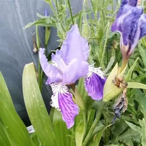 扇形鸢尾,多年生草本,高达100cm。根茎横生,粗壮,直径达1cm,黄白色,节明显;须根分枝较多,黄白色。地上茎扁圆柱形,节明显。叶黄绿色,集生茎顶,基部套叠,排成扇面状,叶片宽剑形,长50-70cm,宽5-7cm,先端渐尖,基部鞘状,花茎高30-50cm,有纵棱和浅沟;总状圆锥花序,有5-7分枝,每分枝处有3-5苞片,内含2-4朵花;花蓝紫色,直径7.5-8cm,花被管长约2cm,外花被裂片倒卵形,有深紫色的斑纹及条纹,边缘波状皱褶,中肋上具黄色鸡冠状附属物,内花被裂片倒披针形或狭倒卵形;雄蕊3,花药黄色;花柱分枝3,淡蓝色,花瓣状;子房下位,纺锤形,长7-8mm。蒴果椭圆状,长2.8-3.5cm,直径1.3-1.5cm,先端具短尖,有6条棱;种子扁平,半圆形,棕褐色,直径约4mm。花期4月,果期5-8月。