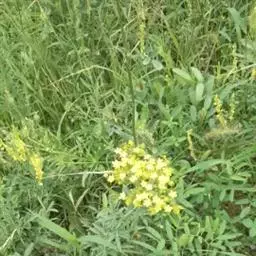 糙叶败酱( Patrinia rupestris Juss.subsp.scabra H.J.Wang),败酱科植物,多年生草本,茎丛生,茎上部多分枝,叶对生,裂片倒披针形、狭披针形或长圆形,聚伞花序顶生,呈伞房状排列,花小,黄色,花冠合瓣,果实翅状,卵形或近圆形,种子位于中央。