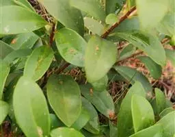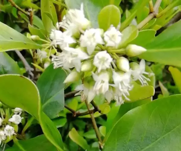 灌木或小乔木,高1.5-4米;小枝无毛,褐黑色。叶互生,于枝条顶端近对生,叶片革质,倒卵形、椭圆形或广倒卵形,顶端圆形或微凹,基部楔形,长3-10厘米,宽2-4.5厘米,全缘,边缘反卷,两面密布小窝点,叶面无毛,中脉平整,侧脉微隆起,背面密被微柔毛,中脉隆起,侧脉微隆起,侧脉7-11对;叶柄长5-10毫米。