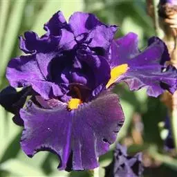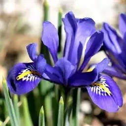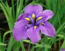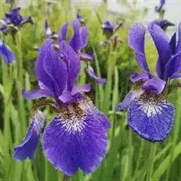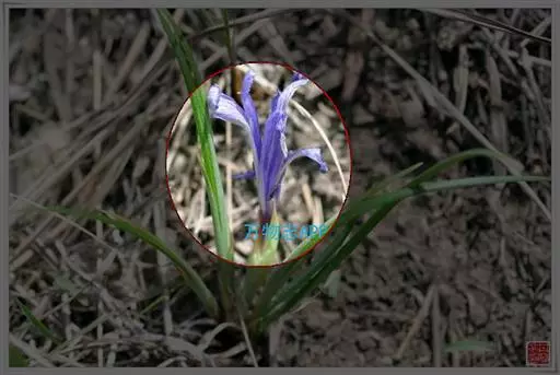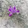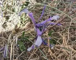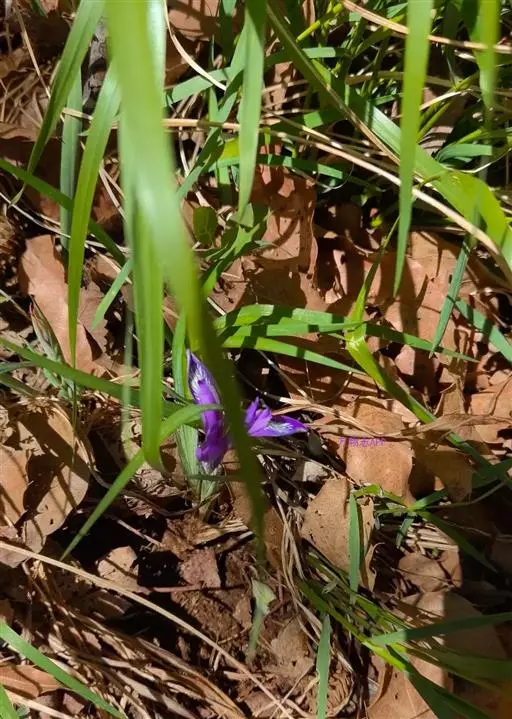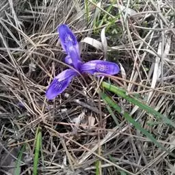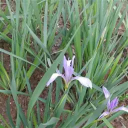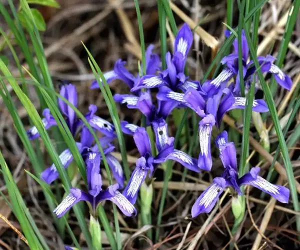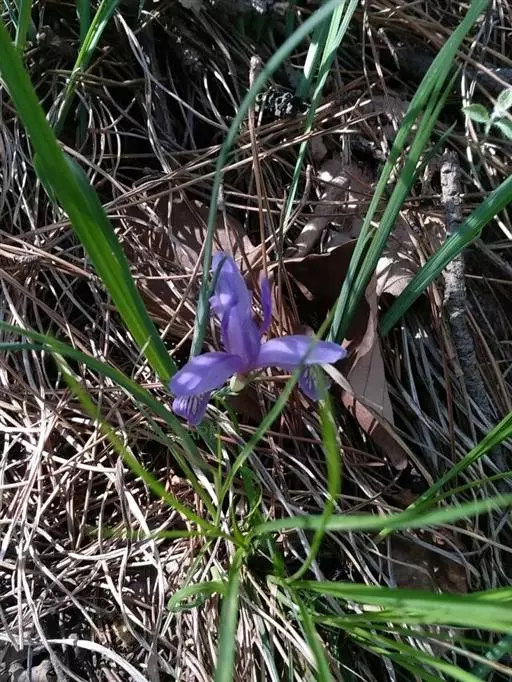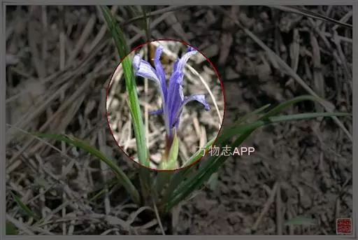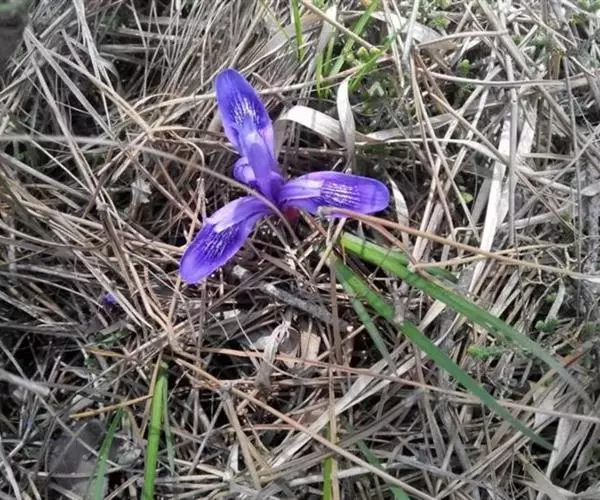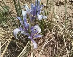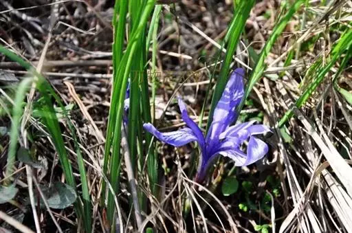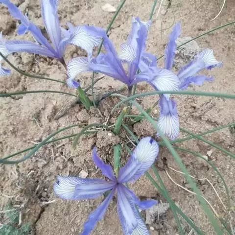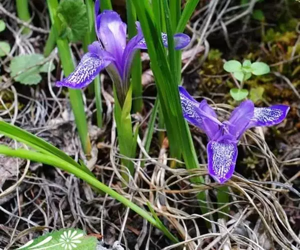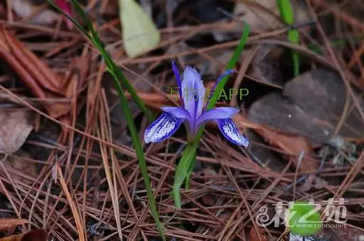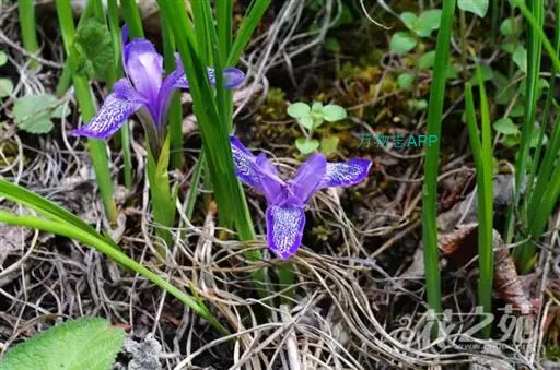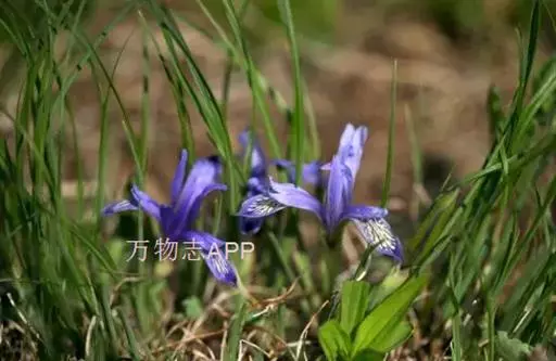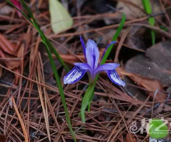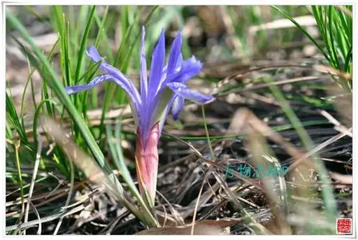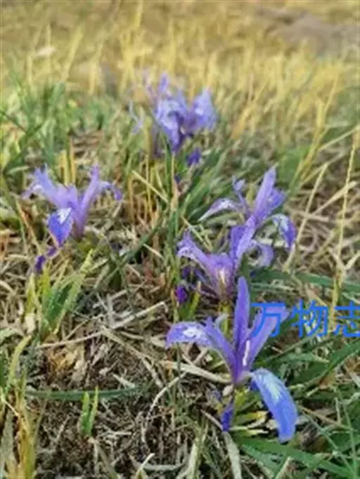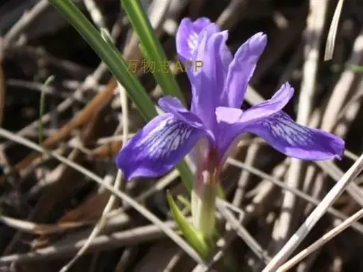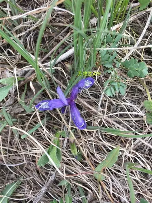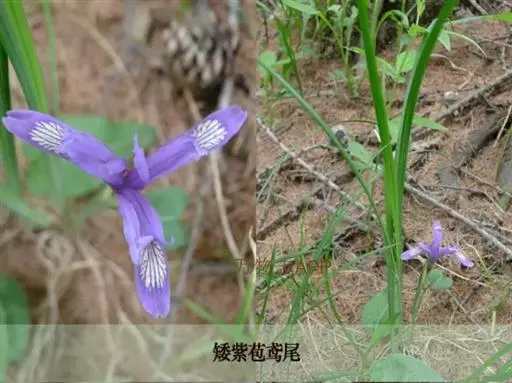 紫苞鸢尾(学名:Iris ruthenica Ker Gawl.):多年生草本,植株基部围有短的鞘状叶。根状茎斜伸,二歧分枝,节明显;须根粗,暗褐色。叶条形,灰绿色,有3-5条纵脉。花茎纤细,略短于叶,高15-20厘米,有2-3枚茎生叶;苞片2枚,膜质,内包含有1 朵花;花蓝紫色,直径5-5.5厘米;外花被裂片倒披针形,有白色及深紫色的斑纹,内花被裂片直立,狭倒披针形。蒴果球形或卵圆形,直径1.2-1.5厘米,6条肋明显,顶端无喙;种子球形或梨形,有乳白色的附属物,遇潮湿易变粘。花期5-6月,果期7-8月。