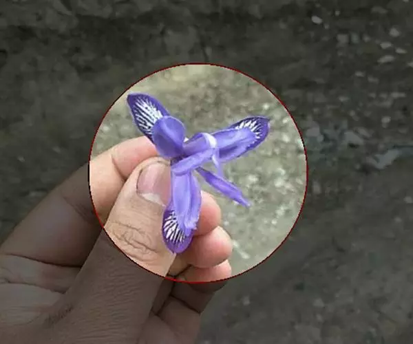 花茎纤细,略短于叶,高15-20厘米,有2-3枚茎生叶;苞片2枚,膜质,绿色,边缘带红紫色,披针形或宽披针形,长约3厘米,宽0.8-1厘米,中脉明显,内包含有1 朵花;花蓝紫色,直径5-5.5厘米;花梗长0.6-1厘米;花被管长1-1.2厘米,外花被裂片倒披针形,长约4厘米,宽0.8-1厘米,有白色及深紫色的斑纹,内花被裂片直立,狭倒披针形,长3.2-3.5厘米,宽约6毫米;雄蕊长约2.5厘米,花药乳白色;花柱分枝扁平,长3.5-4厘米,顶端裂片狭三角形,子房狭纺锤形,长约1厘米。