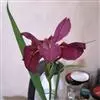 紫苞鸢尾是多年生草本植物,植株基部围有短的鞘状叶。根状茎斜伸,二歧分枝,节明显,外包以棕褐色老叶残留的纤维,直径3-5毫米;须根粗,暗褐色。叶条形,灰绿色,长20-25厘米,宽3-6毫米,顶端长渐尖,基部鞘状,有3-5条纵脉。