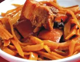 5.油烧热,下姜丝和一勺豆瓣酱炒香;