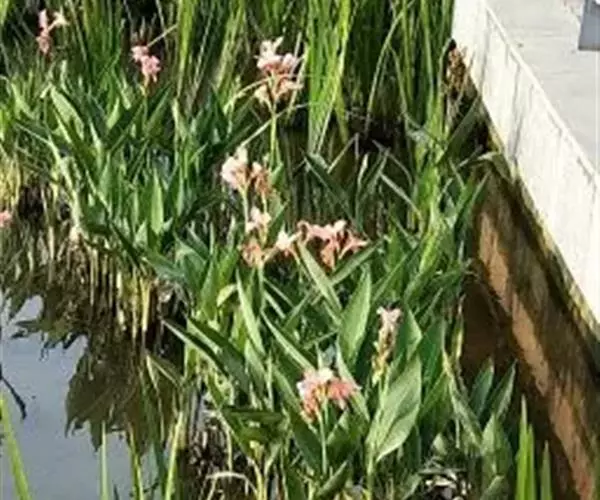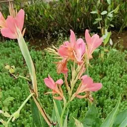 粉美人蕉(学名:Canna glauca L.):是一种球根草本植物。根茎延长,株高1.5-2米;茎绿色。叶片披针形;总状花序疏花,单生或分叉,稍高出叶上;苞片圆形,褐色,花黄色,无斑点;有多种园艺栽培品种,颜色从粉、橙红色及具带红色斑点等。花期:夏、秋。