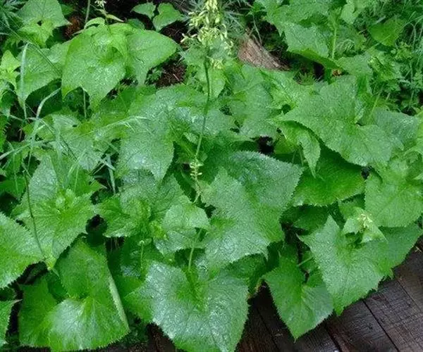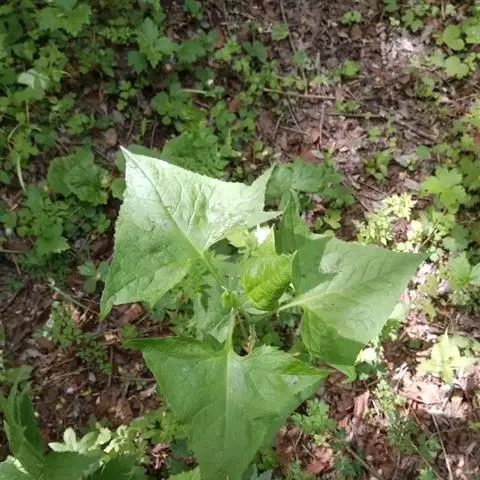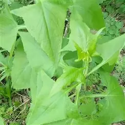 多年生草本,根状茎平卧,有多数较粗的须根。茎粗壮,直立,高(70)100-200厘米,下部直径8-12毫米,具纵条纹,无毛或被疏柔毛。下部叶在花期枯萎,中部叶叶片三角状戟形,稀扁三角状戟形,长20-30厘米,宽20-50厘米,顶端尾状急尖,基部截形或微心形,沿叶柄下延成宽翅,侧生裂片通常2裂,小裂片长披针形,顶端急尖,边缘微凹,具不规则的三角形或披针形的齿,薄质,离基3出脉,侧脉向上分叉,上面暗绿色,被疏短毛,下面淡绿色,沿脉被腺状短柔毛;叶柄短于叶片的2-3倍,具宽1.5-2厘米的翅,基部扩大而抱茎的大耳,上部叶渐小,具短叶柄,下部叶1-2,与中部茎叶同形,但较狭,三角状戟形,具2-3浅裂,或侧裂片边缘有较小的齿。